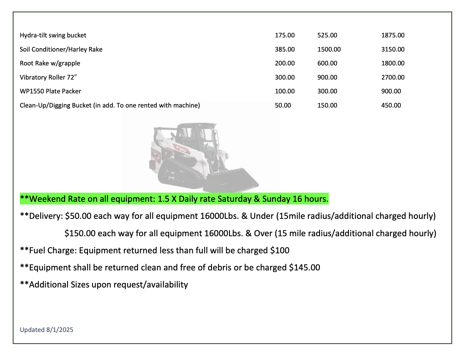 Our rental fleet is built for contractors who need dependable, job-ready equipment without the hassle of ownership. All rentals require proof of insurance and are maintained to the highest standards. Explore our available tractors below.